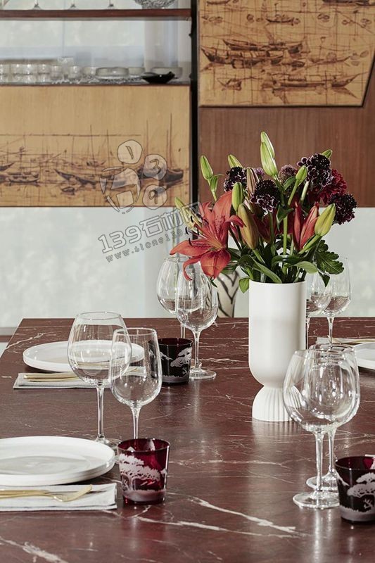 紫羅紅大理石的粉色調(diào)與天然紋路,能為現(xiàn)代家居注入一抹柔美而不失力量的氣息。推薦將其用于小面積桌面裝飾,如搭配金屬框架茶幾(黃銅/不銹鋼),冷暖材質(zhì)碰撞形成視覺張力;或作為餐桌中心臺面,配以白色巖板或木質(zhì)基座,營造輕奢氛圍。