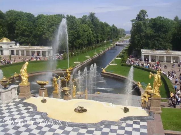 18世紀(jì)中葉,為紀(jì)念俄國在北方戰(zhàn)爭中的勝利,在“彼得大帝夏宮”的前面建造了一個由64個噴泉和250多尊金銅像組成的梯級大瀑布。