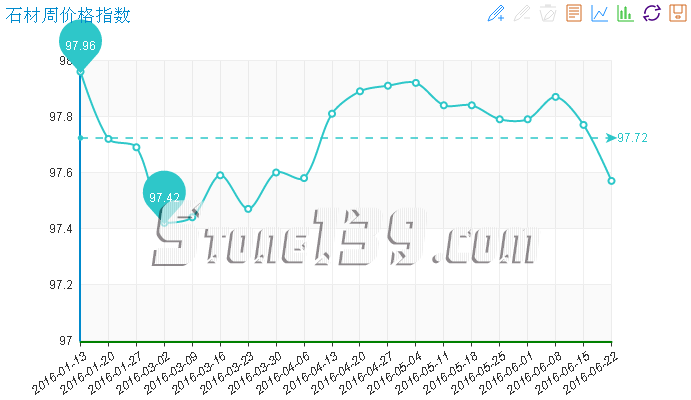 據(jù)“中國(guó)·水頭石材指數(shù)”系統(tǒng)監(jiān)測(cè),20160622期石材周價(jià)格指數(shù)收?qǐng)?bào)于97.57點(diǎn),環(huán)比下調(diào)約0.20點(diǎn),下調(diào)0.21%。本周石材價(jià)格繼續(xù)下滑,其中其他石材類(lèi)價(jià)格繼續(xù)持平,除合成大理石價(jià)格持續(xù)攀升外,大理石、花崗石類(lèi)價(jià)格均出現(xiàn)下調(diào),特別是花崗石價(jià)格的大幅回落帶動(dòng)本周石材價(jià)格呈現(xiàn)下行的態(tài)勢(shì)。本周除少數(shù)合成大理石大板質(zhì)量等級(jí)高、市場(chǎng)需求增加,價(jià)格持續(xù)上調(diào)外,花崗石荒料及成品價(jià)格均隨市場(chǎng)行情下滑而下跌。