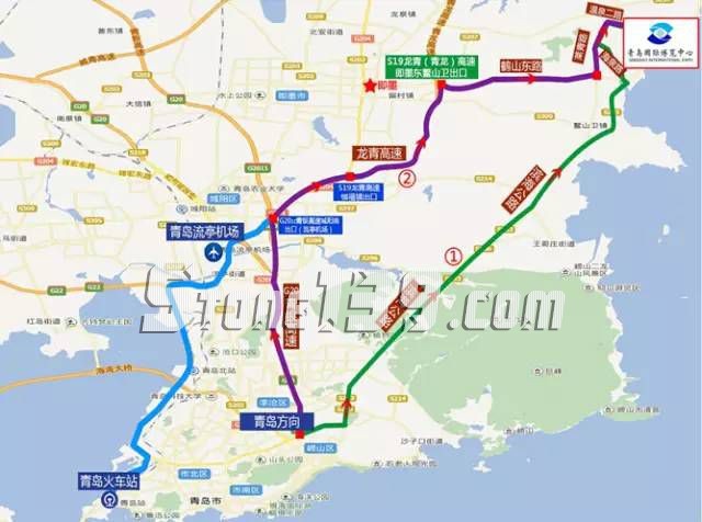 城陽方向車輛G2011青銀高速城陽南出口---S19龍青高速惜福鎮(zhèn)出口---龍青高速即墨東鰲山衛(wèi)出口---鶴山東路---濱海大道(海陽方向)---博覽中心