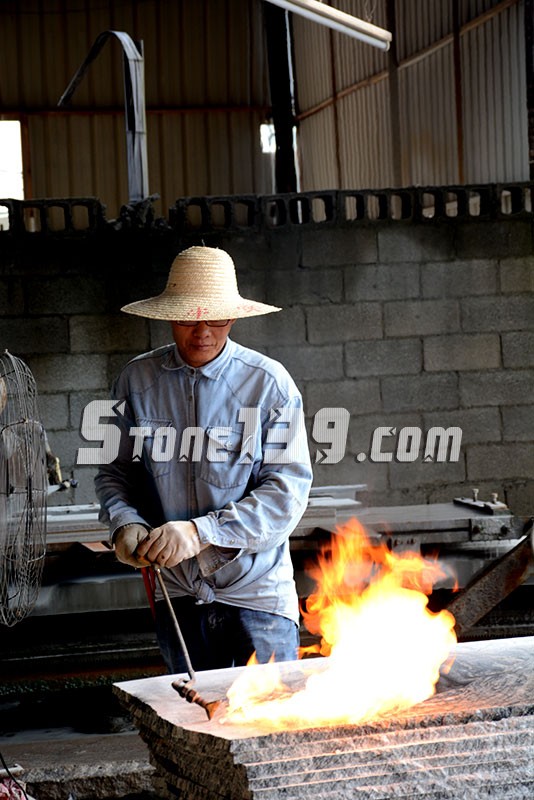 4、火燒石材表面外觀單調(diào)糙面的粗細(xì)程度完全由巖石結(jié)晶程度來決定,粗粒結(jié)構(gòu)的巖石其火燒面必定粗拙,細(xì)粒機(jī)構(gòu)的巖石相對(duì)細(xì)膩一些,換句話說,火燒面的粗拙 程度不能人為控制,只能順其天然。