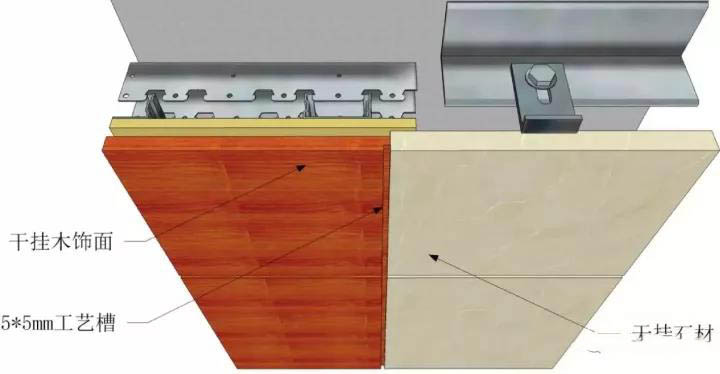 木飾面與石材交界邊緣如圖所示抽槽處理,石材壓木飾面,防止橫向工藝槽陰角處收口露空洞