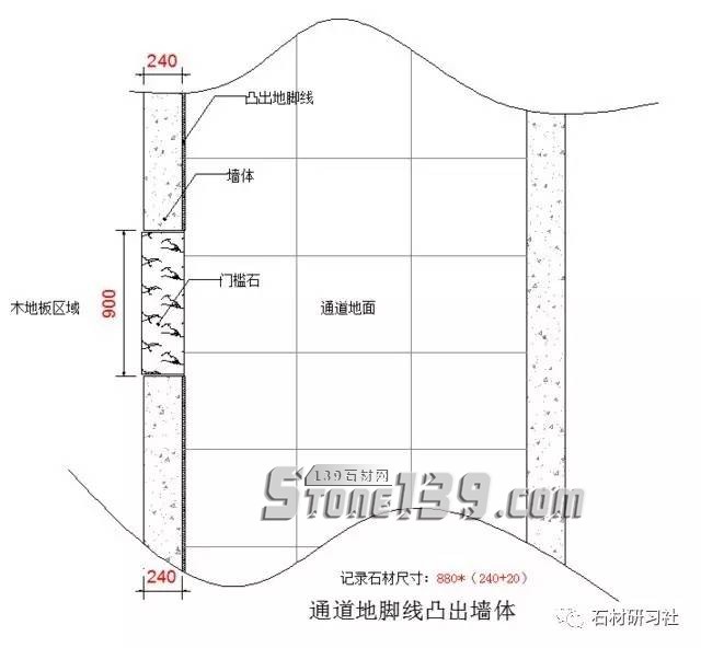 ▼第一個(這是一個通道和房間相連的門檻,地腳線是凸出來的樣式,測量記錄的尺寸是:880*(240+20),門洞的寬原尺寸是900減去了20是方便安裝時有空位,因?yàn)榘惭b房門時還可以遮住。墻厚原尺寸是240mm+20,兩邊各加10mm,因?yàn)槭牡孛妫ǖ匕宕u)和木地板安裝時都不可能緊靠密水泥墻,這也不方便安裝。所以需要加大尺寸來調(diào)節(jié),記錄240+20是一個技巧的問題,240是墻體,20是加大的尺寸,回去下單繪圖時不會忘記或出錯。