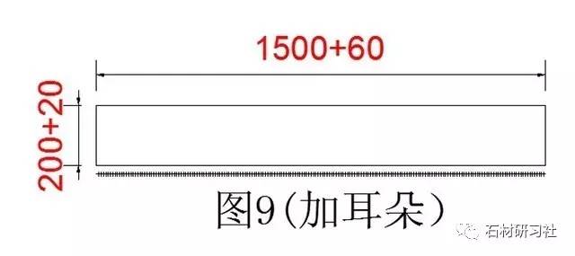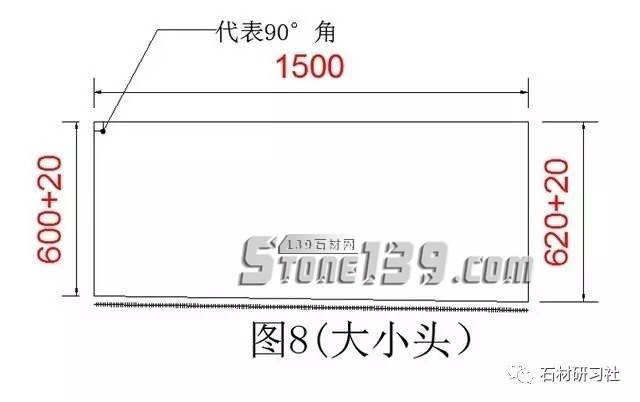 ▼第2個大小窗臺(圖8是一個大小頭的窗臺,600,620和1500是水泥的數(shù)據(jù),加20是加厚磨邊的數(shù)據(jù),記得畫草稿時,一定要記上90°的位置,要不以后搞反反向就安裝不了)