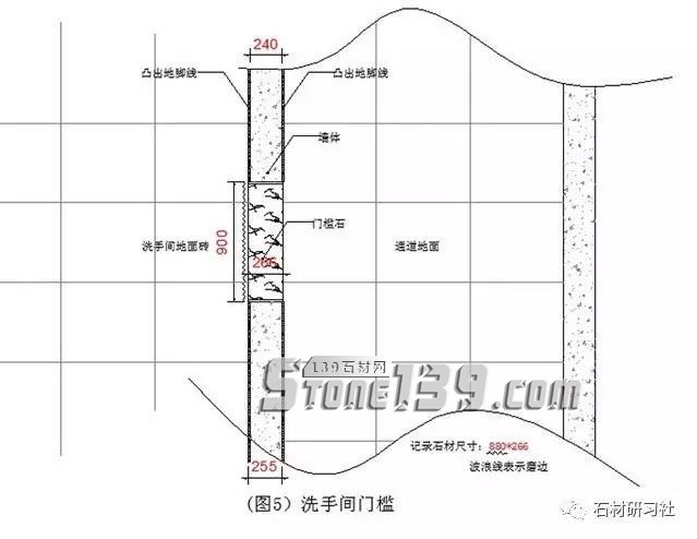 ▼第四個洗手間門檻(圖5是一個洗手間門檻,洗手間墻面如果還沒有貼磚,就事先和施工方溝通貼磚完成面是多少,才能測量記錄尺寸。我這里強(qiáng)調(diào)的是經(jīng)常出錯的就是沒有和客戶溝通好墻完成面,靠洗手間那一邊是否要加厚,磨邊肯定是要的的。我們作為專業(yè)的石材設(shè)計(jì)師,應(yīng)該提議或提醒客戶需要磨哪一種邊最為恰當(dāng)。我個人建議的是R2小圓邊和2*2的斜邊。)