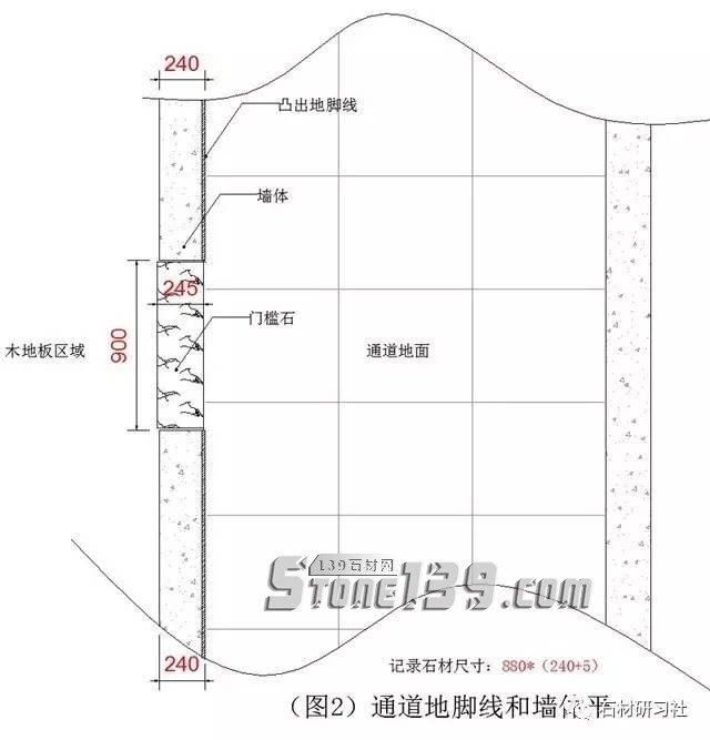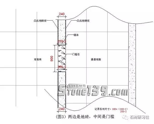 ▼第三個通道(圖3是一個墻面240厚,兩邊安裝師傅已經(jīng)鋪好了地磚,中間留出的一個空地方做門檻石,那就需要測量兩頭的尺寸然后再減去2mm,作為安裝移動空間,大理石不是木頭,剛好和大一點(diǎn)都安裝不了。這個門檻石大小頭,記錄尺寸是880*260(255)-2.)。